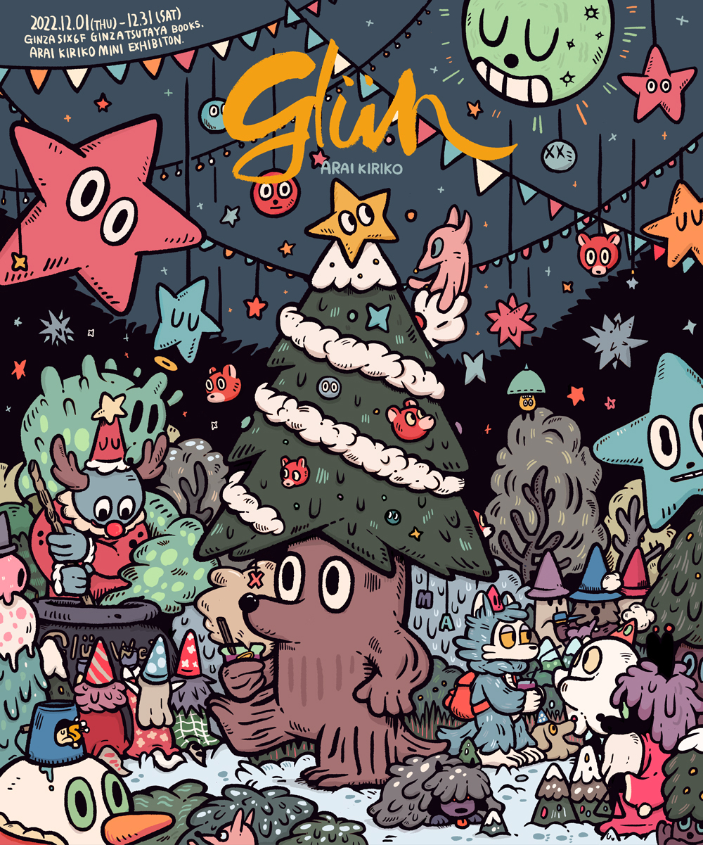 数年前にドイツで行ったクリスマスマーケットに思いを馳せつつ、クリスマスツリーくんのツリー型の原画や、新作のソフビおおかみくん「クリスマスの星」など、クリスマスに因んだここでしか手に入らないグッズを揃えています。是非、おおかみくんやおばけたちのクリスマス会にお越し下さいませ。